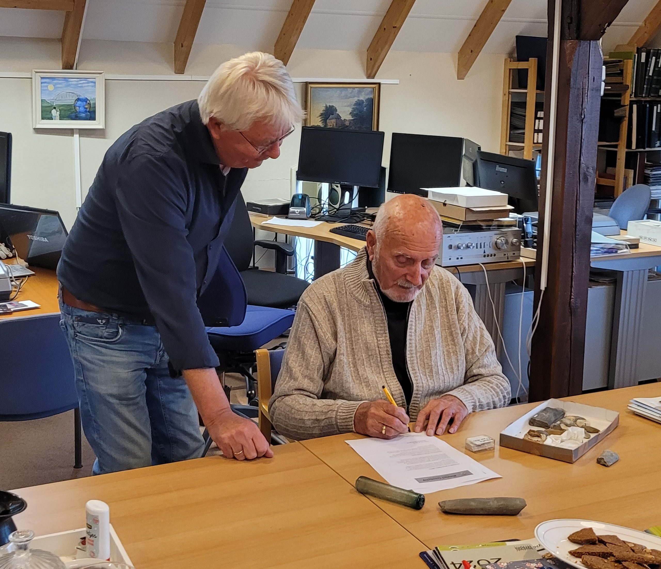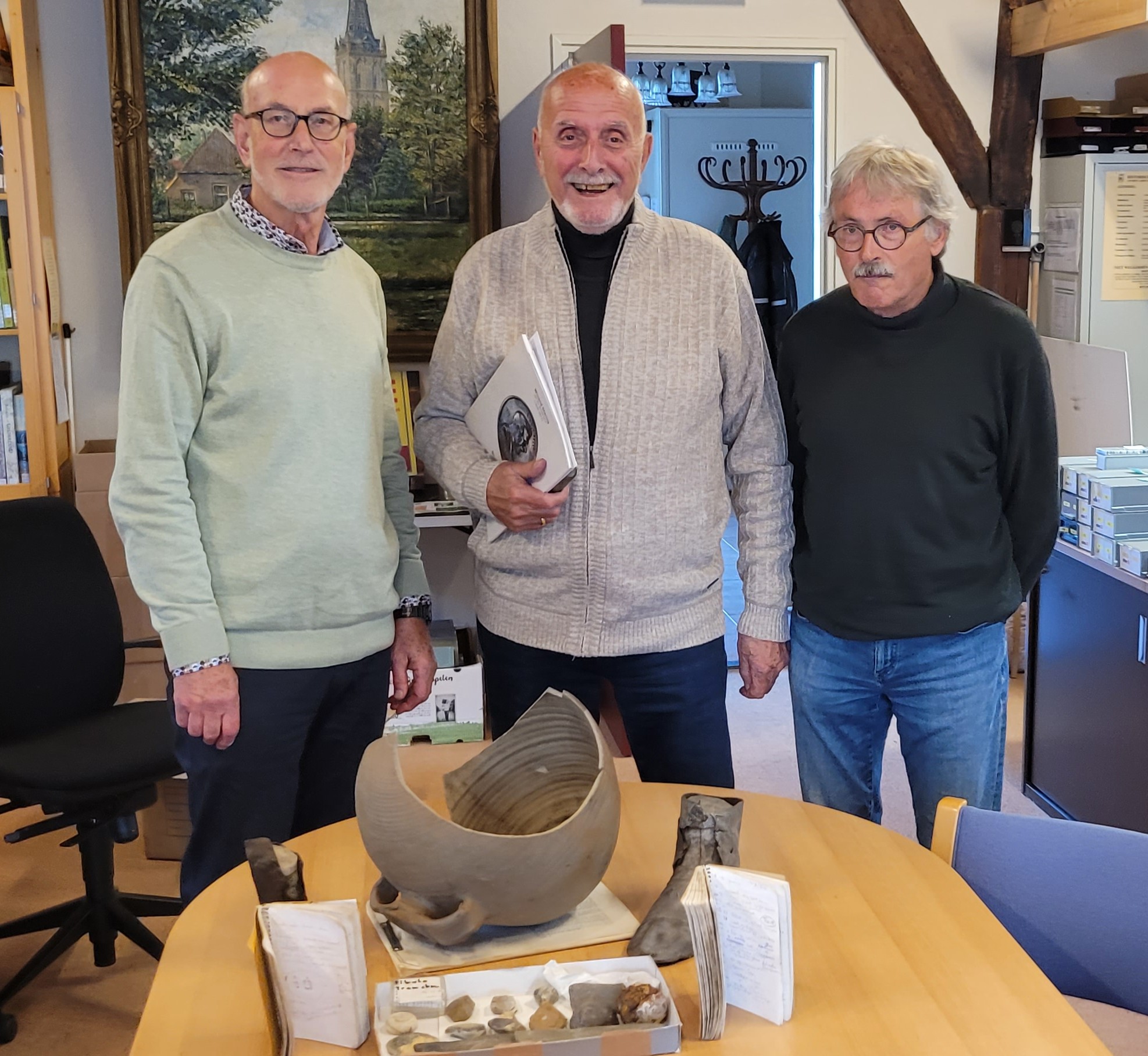 Schenking archeologische verzameling Ben de Graaf Donderdag 16 oktober kreeg het Historisch Genootschap een prachtige collectie overgedragen: de volledige archeologische verzameling van de Lochemse amateurarcheoloog Ben de Graaf. Een enorme hoeveelheid bodemvondsten, bodemmonsters, beschrijvingen van vindplaatsen etc. Ben: hartelijk dank voor het in ons gestelde vertrouwen en voor deze fantastische schenking! Oproep nieuwe leden werkgroep Archeologie We gaan de komende periode aan de slag met inventariseren, documenteren, fotograferen en beschrijven van alle stukken uit deze nieuwe archeologische verzameling. Hebt u affiniteit met archeologie en wilt u ons helpen bij deze mooie klus? Neem vrijblijvend contact op met onze voorzitter Paul Roodbol via voorzitter@hglochem.nl. De Werkgroep Archeologie gemeente Lochem is een gezamenlijke activiteit van het Historisch Genootschap, De Elf Marken en AWN18, ondersteund door de archeologische afdeling van de gemeente Lochem. Foto 1: Ben de Graaf bij het tekenen van het overdrachtsformulier in het bijzijn van onze secretaris Sietze Pen Foto 2: v.l.n.r. Jan Venselaar (HG), Ben de Graaf en Gerard Tiemessen (AWN18)